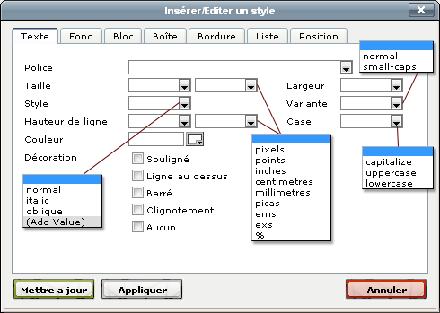 Les styles CSS suivants sont applicables à une portion de texte en le sélectionnant, et à l'ensemble des balises classiques en la sélectionnant dans la barre d'état de l'éditeur.